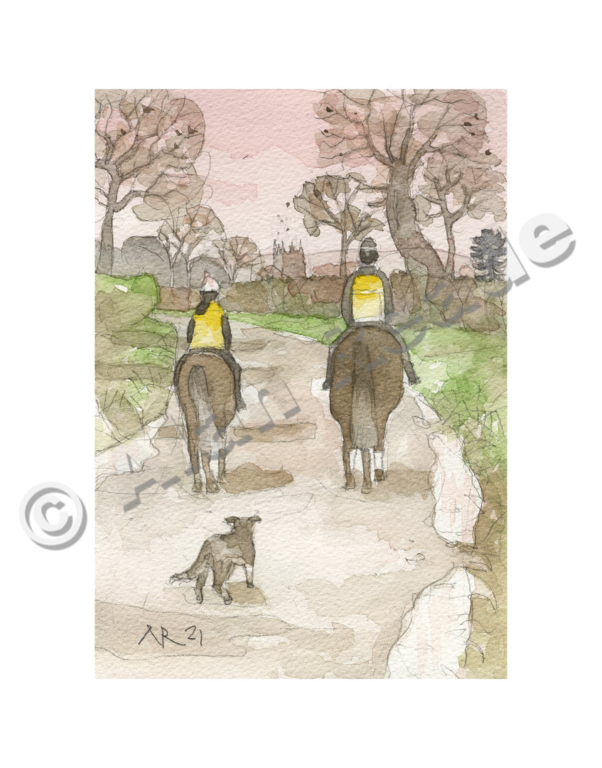 Equestrian Exercise. Mounted Giclee Print by Alan Reade. Finished size 10" x 8" ready to frame. Greetings cards approx 150mm x 110mm.