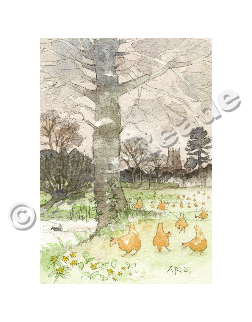Free Range Chickens. Mounted Giclee Print by Alan Reade. Finished size 10" x 8" ready to frame. Greetings cards approx 150mm x 110mm.