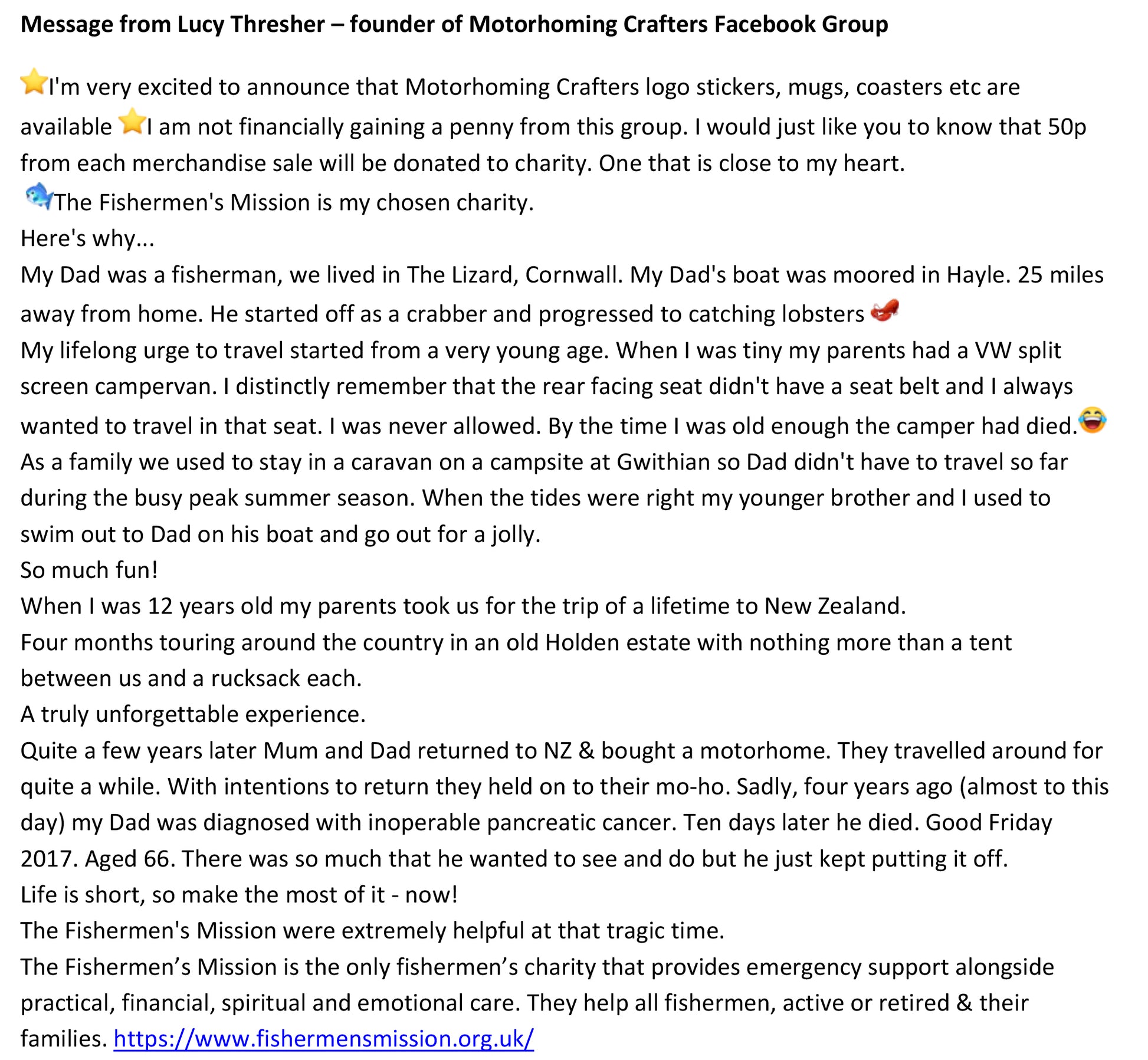 Motorhoming Crafters Sticker - Window Cling for inside and Vinyl for the outside of your motorhome or camper. Rounded corners. 50p from each will go to the Fisherman's Mission Charity.